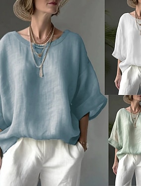 Mulheres Linho de algodão sintético Côr Sólida Tecido Elegante Boêmia Vintage Manga Curta Tops regulares Branco Verde Claro Azul Céu Verão Primavera Outono Inverno