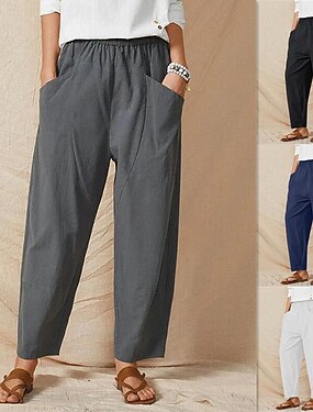 Mulheres Linho de algodão sintético chinês Calça verão Calças Harem Férias Roupa de rua Básico Comprimento total Cintura Média Tecido Com Cordão Bolsos Confortável Sem Elasticidade Diário Ao ar livre