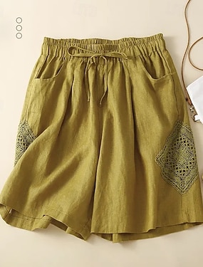 Mulheres Linho de algodão sintético Calção Calças Shorts de verão Roupa de rua Casual Curto Natural Tecido Bolsos Design de cordão elástico Confortável Ao ar livre Para Noite Adamascado Jacinto Preto