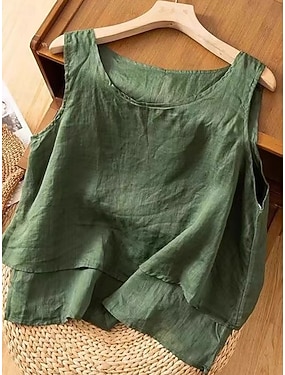 Mulheres Camisola Regata Linho de algodão sintético Franzido Côr Sólida à moda Casual Sem Manga Gola Redonda Tops regulares Diário Preto Branco Verde Verão