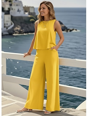 Mulheres Conjuntos de linho de algodão Conjuntos de duas peças Blusa Calças Sem Manga Gola Redonda Côr Sólida Elegante Moda Roupa de rua Casual Diário Ao ar livre Preto Amarelo Azul Marinho Escuro