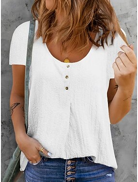 Mulheres Camisa Social Blusa Camisa de algodão Linho de algodão sintético Botões Tecido à moda Clássico Moderno Manga Curta Gola Redonda Tops regulares Diário Feriado Para Noite Azul Preto Branco