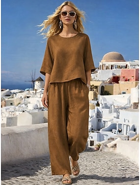 Mulheres Conjuntos de linho de algodão Manga 3/4 Decote Redondo Férias Básico Casual Diário Férias Preto Branco Azul Marinha Verão Ajuste Largo