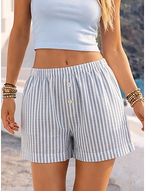 Mulheres Linho de algodão sintético chinês Calção Calça casual Férias Básico Casual Curto Cintura Alta Gráfico Listrado Fivela Imprimir Macio Exterior Confortável Com Stretch Casual Diário Ao ar livre