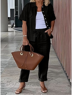 Mulheres Conjuntos de calças Linho de algodão sintético Manga Curta Colarinho de Camisa Tecido Franzido Com Cordão Elegante Moda Roupa de rua Casual Diário Ao ar livre Preto Branco Cinzento Verão