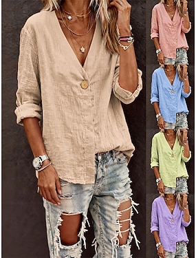 Mulheres Camisa Social Mistura de Algodão Blusa Botões Tecido Moderno Casual Manga Longa Decote V Tops regulares Diário Para Noite Amarelo Rosa Cáqui Cinzento Verão