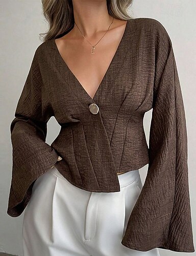 Mulheres camisa de verão Camisa casual Blusa Franzido Botões Barra Assimétrica Côr Sólida Tecido Elegante à moda Casual Manga Longa Sino Decote V Tops curtos Diário Feriado Para Noite Marron