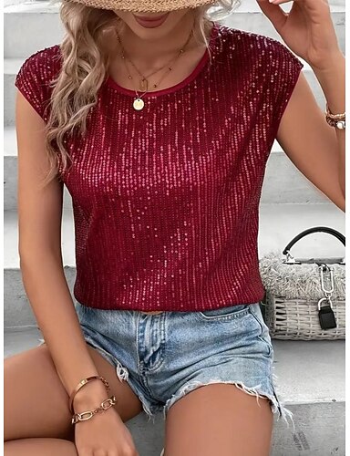 Mulheres Camiseta Paetês Tecido Casual Sem Manga Gola Redonda Tops regulares Diário Para Noite Final de semana Preto Branco Rosa Vinho Verde Escuro Verão Primavera