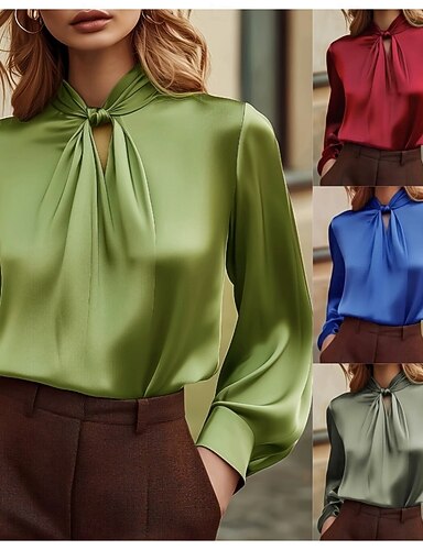 Mulheres Blusa de cetim Saia Blusa Franzido Côr Sólida Elegante Vintage à moda Manga Longa Colarinho Chinês Tops regulares Diário Festa Azul Verde Sage Vermelho Verde Primavera Outono