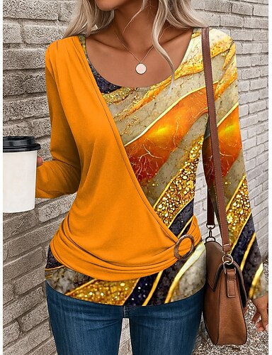 Mulheres Camiseta Imprimir Gráfico Geométrica Abstrato Vintage à moda Clássico Manga Longa Decote V Pescoço Entalhado Tops regulares Diário Azul Roxo Dourado Verde Primavera Outono Inverno