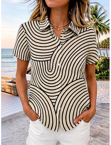 Camisa Feminina Manga Curta Gráfica Geométrica Listrada Vintage Tropical Estilosa Gola Camisa Regular Tops Diários Azul Roxo Verde Cáqui Verão Primavera