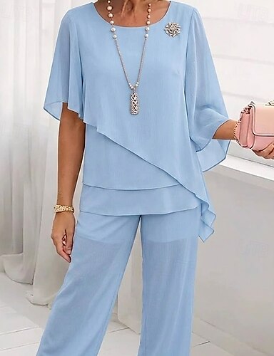 Mulheres Conjuntos de duas peças Chifon Manga Curta Borboleta Decote Quadrado Côr Sólida Tecido Multi Camadas Elegante Formal Convidado do casamento Casual / Diário Azul Azul Céu Verão Normal