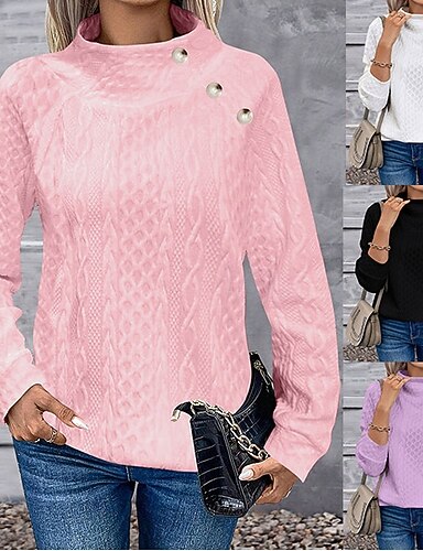 Moletom feminino elegante, moda fofa, cor sólida, gola alta, botões, texturizado, manga comprida, regular, tops de malha, trabalho para casa, preto, branco, primavera, outono