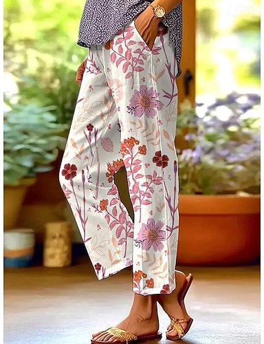 Mulheres Calça casual Calças Reto Férias Moda Roupa de rua Mimolet Cintura Média Floral Gráfico Bolsos Cintura elástica Imprimir Confortável Conforto Respirabilidade Sem Elasticidade Diário Ao ar