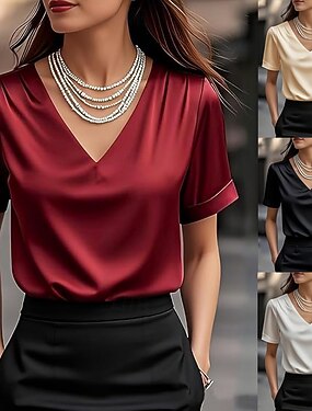 Mulheres Top de cetim Camiseta T-shirt Tecido Elegante Moda à moda Manga Curta Decote V Tops regulares Diário Para Noite Final de semana Azul Preto Branco Verde Claro Laranja Verão Primavera