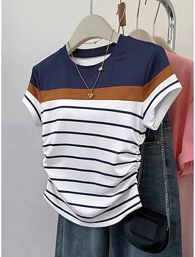 Mulheres Camiseta T-shirt Imprimir Listrado Moda à moda Clássico Manga Curta Gola Redonda Tops regulares Diário Para Noite Final de semana Azul Rosa Verão Primavera