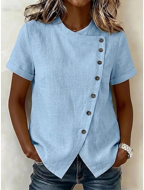 Mulheres Camiseta T-shirt Botões Tecido Moda à moda Clássico Manga Curta Gola Redonda Tops regulares Diário Para Noite Final de semana Azul Preto Branco Vinho Marron Verão Primavera