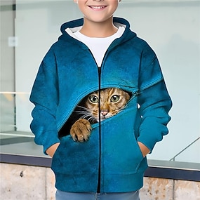 Para Meninos 3D Gato Moletom Casaco Casacos Manga Longa Outono Inverno Ativo Roupa de rua Legal Poliéster Infantil 3-12 anos Com Zíper Rua Diário Normal