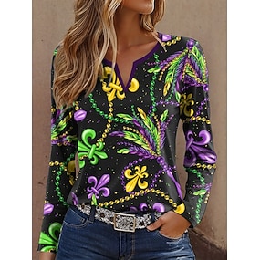 Blusa Feminina do Mardi Gras Linho Semelhante Respirável Leve Gráfica Vintage Estilosa Diária de Manga Longa V Neck Tops Regulares Estampa do Dia das Férias Amarelo Roxo Verde Verão Primavera