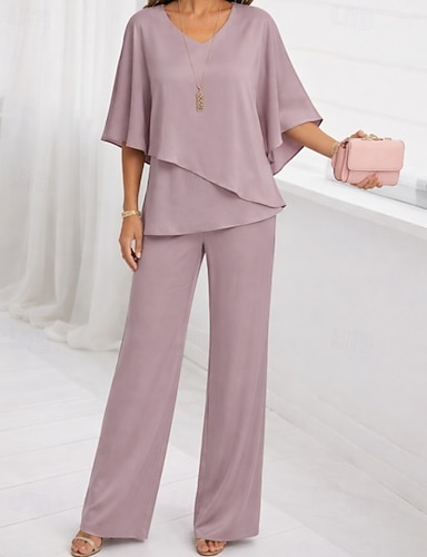 Mulheres Blusa Calças Pernas Largas Manga 3/4 Decote V Tecido Frufru Moda Roupa de rua Diário Casual Diário Rosa Roxo Cáqui Primavera & Outono Normal