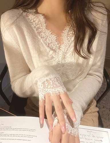 Mulheres Blusa Tops de renda Renda Patchwork Côr Sólida à moda Moderno Casual Manga Longa Decote V Tops regulares Diário Feriado Para Noite Preto Branco Damasco Verão Primavera Outono Inverno