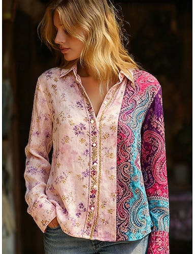 Mulheres Camisa Social camisa Boho Linho de algodão sintético Patchwork Botões Imprimir Floral Estampado Cashemere Boêmia Ativo Vintage Manga Longa Colarinho de Camisa Tops regulares Diário Feriado