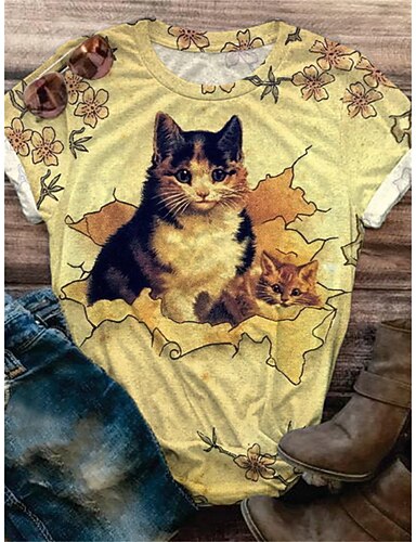 camiseta feminina estampa de gato moda manga curta regular tops gola redonda diário fim de semana preto amarelo azul marinho bege verão