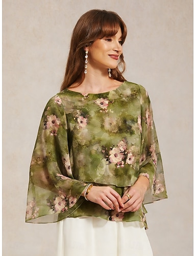 Mulheres Blusa Tops de chiffon Tops de renda Cordões Multi Camadas Floral Elegante Manga 3/4 Gola Redonda Tops regulares Diário Convidado do casamento Verde Verão Primavera Outono