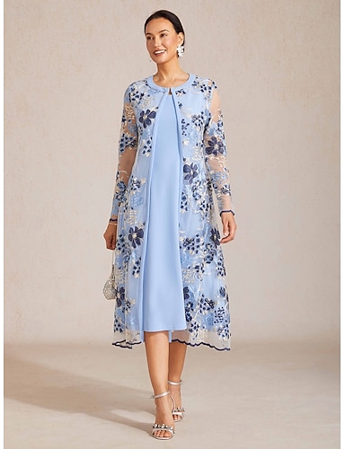 Mulheres Vestido midi Vestido da bainha Vestido com jaqueta Elegante coquetel Vestidos Semi-Formais Formal Festa Convidado do casamento Normal Floral Manga Longa Gola Redonda Azul Primavera Outono