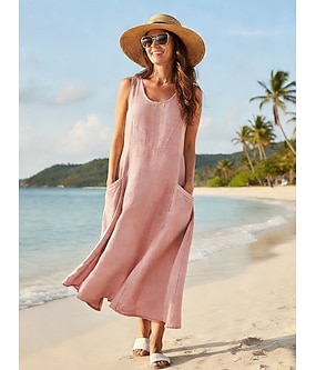 Mulheres Vestido Longo 100% Algodão Vestido de turno Vestidos Para o Verão vestido de praia Elegante Moda Moderno Ao ar livre Praia Férias Normal Tecido Sem Manga Gola Redonda Roxo Marron Azul Escuro