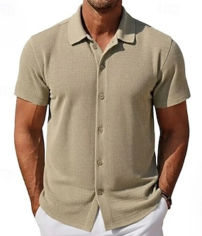 Homens Camisa Social Textura Camisa casual camisa de botão Preto Branco Caqui Manga Curta Tecido Aberto para a Lateral Casual Diário Vazado Roupa Elegante Moda Casual