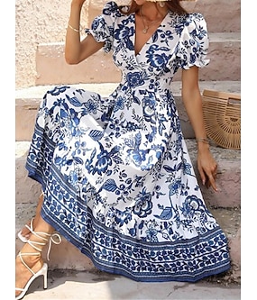 Mulheres Vestido midi Vestido casual Vestido Swing Vestido A Line Vestido de verão Roupa de rua Evasê Férias Rua Feriado Normal Floral Manga Curta Decote V Preto Vermelho Azul Verde Verão