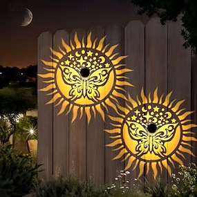 2 luminárias solares de parede em ferro fundido com recortes em formato de lua, estrelas e borboletas, ideais para decoração de jardins, varandas, degraus e paisagens externas.