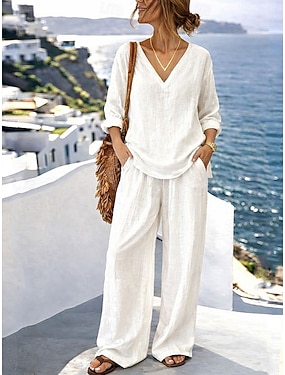 Mulheres Conjuntos de linho de algodão Conjuntos de calças Manga Longa Decote V Côr Sólida Moda Roupa de rua Casual Diário Ao ar livre Azul Branco Marron Verão Ajuste Largo