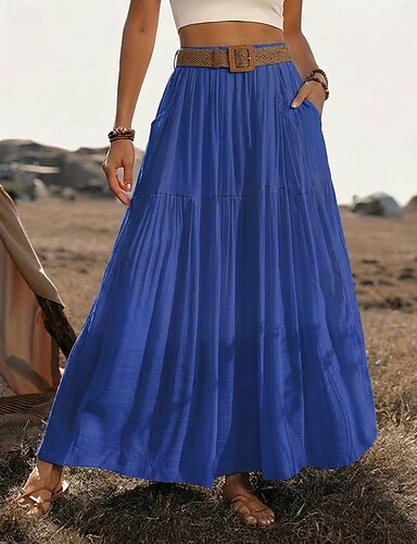 Mulheres Tamanho Asiático Saia de férias Casual Verão Longo Cintura Alta Saias Cor Sólida Franzido Pregueado Bolsos Sem Elasticidade Diário Férias Verde Maçã Vermelho Azul Royal Verde Escuro Verão