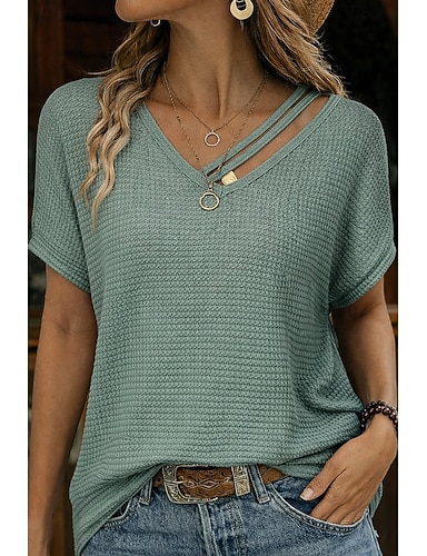Mulheres Camisa Social Camisa Waffle Camisa Popover Camisa casual Côr Sólida Tecido Férias Moda Casual Manga Curta Decote V Tops regulares Streetwear Praia Feriado Verde Verão Primavera Outono