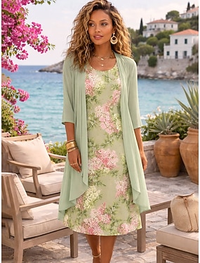 Mulheres conjunto de vestido Vestido A Line Elegante Férias Floral Gráfico Multi Camadas Imprimir Vestido midi Meia Manga Gola Redonda Diário Verde Bege Verão Primavera Normal