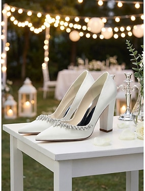 Sapatos de salto alto brancos de cetim para noivas, com laço e detalhes em pérola, bico fino, ideais para casamentos no jardim. &chá de panela