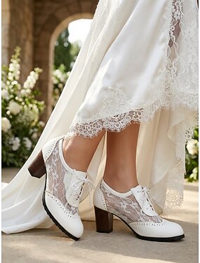Sapatos oxford femininos de salto bloco em renda marfim, elegantes sapatos de noiva com inspiração vintage para um casamento chique na cidade.