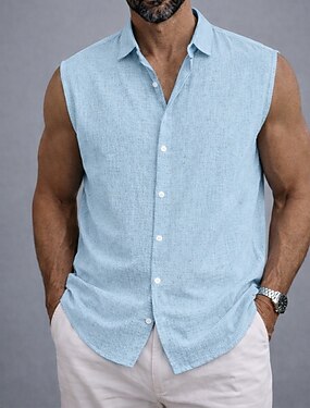 Homens Camisa Social Camisa de linho camisa de verão Roupa de Praia camisa de botão camisa sem manga Côr Sólida Casual Férias Azul Preto Branco Rosa Sem Manga Aberto para a Lateral Verão Primavera