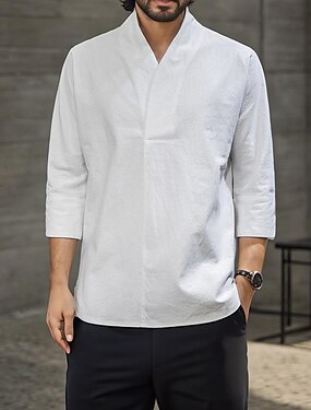 Homens Camisa Social Camisa de linho de algodão Camisa de algodão branco Camisa casual Tecido Havaiana Feriado Preto Branco Amarelo Azul Marinha 3/4 de Manga Decote V Primavera Verão Roupa