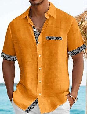Homens Geométrica Camisa de linho camisa de verão camisa de botão Manga Curta Vintage retrô Férias Feriado Roupa de Praia Verão Primavera Aberto para a Lateral camisas de colarinho Um bolso frontal