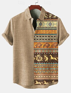 Homens Camisa Social camisa de linho camisas retrô camisa vintage Camisa étnica Tribal Diário Azul Verde Caqui Manga Curta Aberto para a Lateral Verão Primavera Roupa