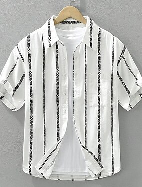 Homens Camisa de linho camisa de verão Roupa de Praia camisa de botão Listrado Férias Casual Preto Branco Manga Curta Aberto para a Lateral Verão Primavera Roupa
