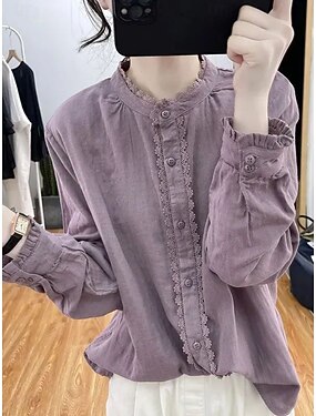 Blusa de Linho Feminina Estilo Algodão Linho Botões com Detalhes em Renda Cor Sólida Vintage Casual Manga Longa Gola Alta Tops Regulares Diária Branca Roxa Verde Primavera Outono