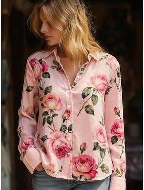 Mulheres Camisa Social camisa Boho Linho de algodão sintético Botões Imprimir Floral Boêmia Ativo Casual Manga Longa Colarinho de Camisa Tops regulares Diário Feriado Rosa Verão Primavera Outono