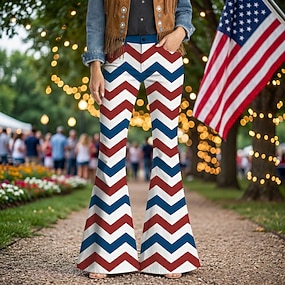 250º Aniversário EUA Retro Vintage Anos 70 Calças Calça boca de sino Hippie Discoteca Cintura Alta Ziguezague Fantasia Mulheres Baile de Máscaras 4 de julho Festa Dia da Independência Adulto Calças