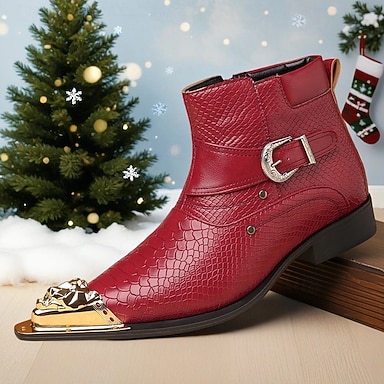 Botas de cano curto masculinas de couro sintético vermelho com estampa de cobra e detalhe metálico nos dedos – calçados de Natal da moda para festas de fim de ano e eventos de inverno