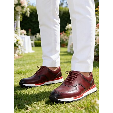 Tênis de corrida masculino em couro bordô – design esportivo com ajuste confortável, perfeito para casamentos casuais, eventos ao ar livre e uso nos fins de semana.