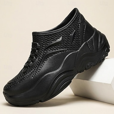 Tamancos masculinos pretos vazados, casuais, leves e respiráveis, confortáveis para caminhada, calçado moderno de verão para uso diário, viagens, lazer ao ar livre e estilo urbano.